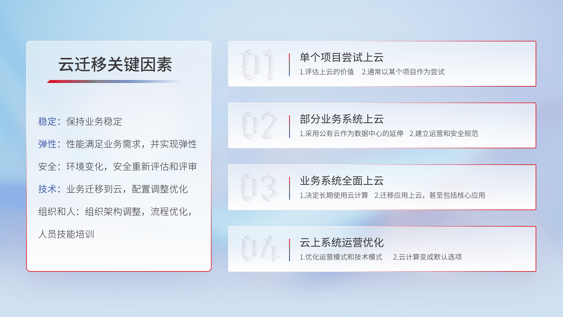 结合实际业务,,从规划设计、、云平台选型、、云原生改造、、、数据迁移、、、、集成交付,,,迁移全过程为客户识别最佳上云路径,,做好风险识别管理,,设计网络架构、、身份权限、、、安全审计合规、、操作审计、、、、日志审计、、监控告警策略、、、、多站点容灾设计等,,,对云上基础设施进行整体规划,,提升IT治理水平,,以满足弹性、、高可用、、高性能的需求。。。。